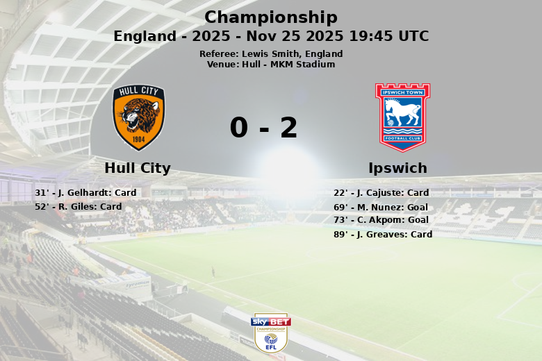 Hull, Angleterre – Lors d’un match disputé au MKM Stadium sous l’œil attentif de l’arbitre Lewis Smith, Ipswich a dépassé Hull City avec un score de 2-0 lors de la 17e journée de Championship. Le match, correspondant à la saison 2025, a été caractérisé par une première mi-temps relativement équilibrée, marquée par deux cartons jaunes, un pour J. Cajuste d’Ipswich et un autre pour J. Gelhardt de Hull City.
