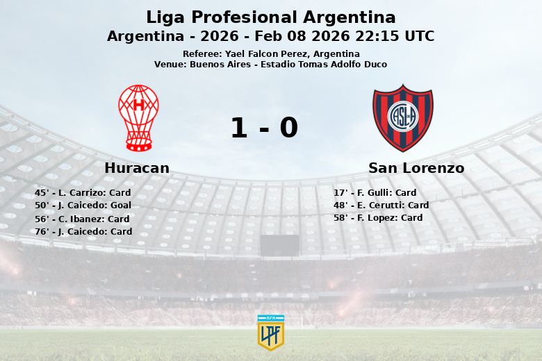 Dans un match disputé à l’Estadio Tomás Adolfo Ducó de Buenos Aires, Huracán a battu San Lorenzo sur le score de 1 à 0. Le match, correspondant à la quatrième journée de la Liga Profesional Argentina 2026, a été marqué par l’intensité et le jeu physique, reflétés dans le nombre de cartons jaunes montrés par l’arbitre Yael Falcón Pérez.