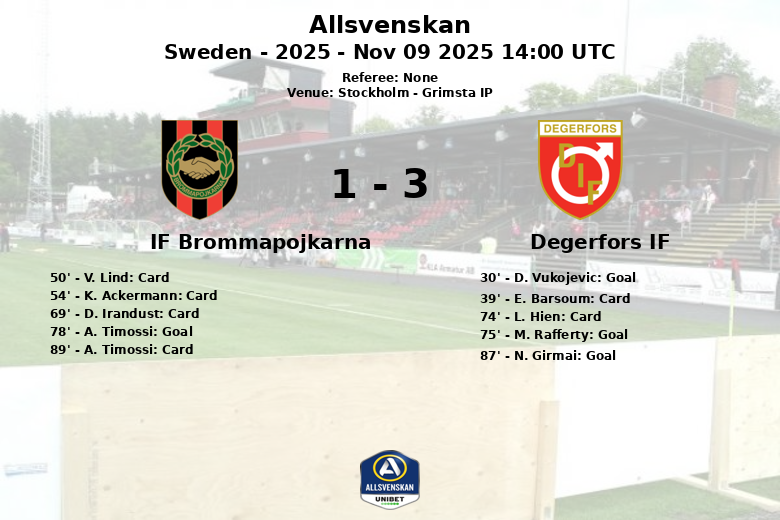 La seconde mi-temps a continué sur un rythme effréné, comme en témoignent les cartons jaunes à V. Lind (50′) et K. Ackermann (54′) pour Brommapojkarna. M. Rafferty a étendu l’avance de Degerfors IF à la 75e minute, avec une passe décisive de D. Vukojevic. Brommapojkarna a rapidement réagi avec un but de A. Timossi à la 78e minute, insufflant de l’espoir aux supporters locaux. Cependant, N. Girmai a scellé le match à la 87e minute pour Degerfors IF. Vers la fin, A. Timossi de Brommapojkarna a reçu un carton jaune à la 89e minute.