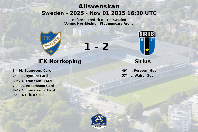 Sirius a ouvert le score à la 49e minute avec un but de J. Persson, servi par O. Krusnell. L’avance a été étendue à la 57e minute grâce à L. Walta, qui a reçu une passe précise de I. Bjerkebo. IFK Norrköping a réduit l’écart à la 90e minute avec un but de T. Prica, servi par A. Bronner, mais il était trop tard pour changer le cours du match.