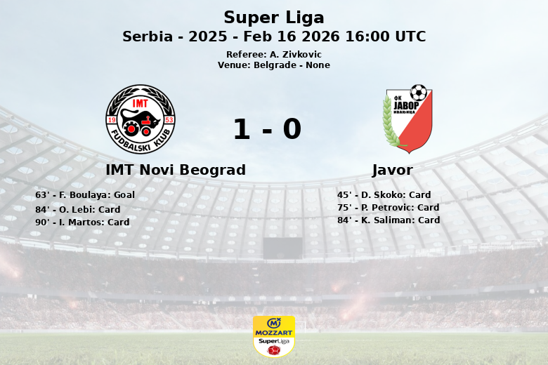 Remplacements dans l’quipe de imt novi beograd: À la 63e minute, C. Keita est entré et O. Lebi est sorti., À la 73e minute, D. Zagar est entré et S. Karamoko est sorti., À la 90e minute, L. Lukovic est entré et J. Tiendrebeogo est sorti.