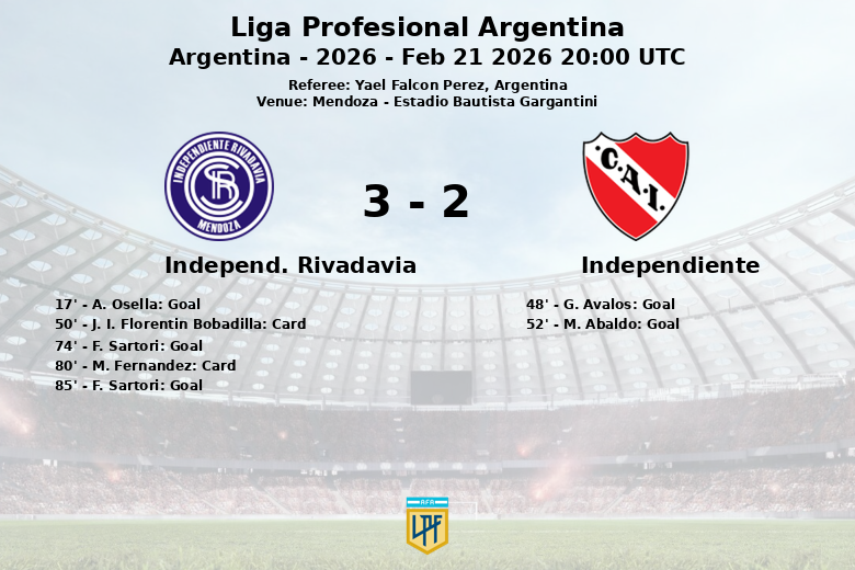 Remplacements dans l’quipe de independ. rivadavia: À la 58e minute, L. Costa est entré et R. Atencio est sorti., À la 71e minute, A. Osella est entré et E. Bonifacio est sorti., À la 71e minute, G. Rios est entré et D. Crego est sorti., À la 84e minute, M. Fernandez est entré et V. Ramis est sorti.