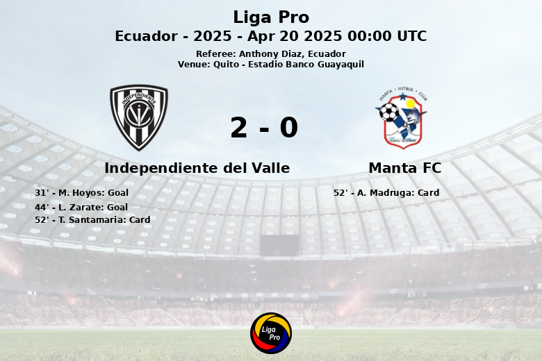 Malgré les nombreux changements effectués par les deux équipes en seconde période, le score n’a pas bougé. Manta FC a peiné à créer des occasions de but (3 tirs, aucun cadré), soulignant la différence de possession et d’efficacité offensive. Les deux équipes ont reçu un carton jaune chacune. L’arbitre du match était Anthony Diaz, d’Équateur. Une victoire facile pour l’Independiente del Valle qui consolide sa position en tête du classement.