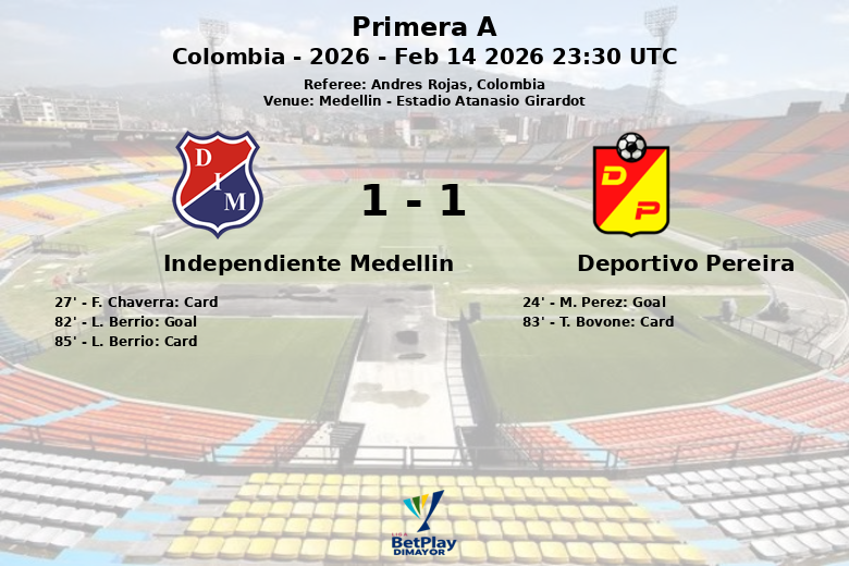 Dans un match disputé à l’Estadio Atanasio Girardot de Medellín, Deportivo Pereira et Independiente Medellín ont fait match nul lors d’une rencontre pleine d’intensité et d’occasions. Deportivo Pereira a pris l’avantage à la 24e minute grâce à un but de M. Perez, sur une passe de W. Pacheco. Cependant, la situation s’est compliquée pour Independiente Medellín lorsque F. Chaverra a reçu un carton rouge à la 27e minute, les laissant avec un joueur de moins pendant une grande partie du match.