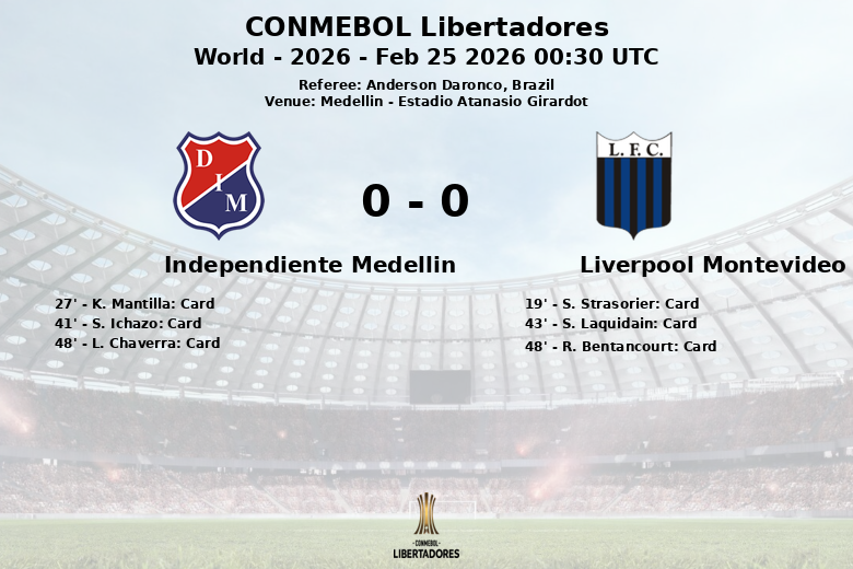 Medellín, Colombie – Dans un match acharné au stade Atanasio Girardot, Independiente Medellín et Liverpool Montevideo ont fait match nul dans une rencontre marquée par l’intensité et les fautes constantes. L’arbitre Anderson Daronco n’a pas hésité à sortir les cartons jaunes, avec trois avertissements pour chaque équipe.
