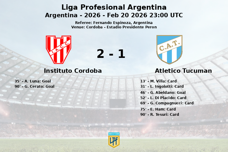 Instituto Córdoba a ouvert le score à la 35e minute grâce à un penalty transformé par A. Luna. Atletico Tucumán a réagi rapidement au début de la seconde période, égalisant à la 46e minute grâce à un but de G. Abeldano, servi par R. Tesuri. Cependant, à la 90e minute, G. Cerato a scellé la victoire pour Instituto Córdoba avec un but, assisté par J. Lazaro.