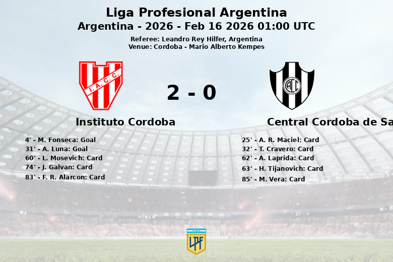 Remplacements dans l’quipe de instituto cordoba: À la 71e minute, M. Fonseca est entré et L. Rafaelli est sorti., À la 81e minute, J. E. Cordoba Mosquera est entré et N. Guerra est sorti., À la 82e minute, A. Luna est entré et J. Acevedo est sorti., À la 82e minute, G. A. Lodico est entré et J. Mendez est sorti., À la 87e minute, G. Cerato est entré et H. De La Fuente est sorti.