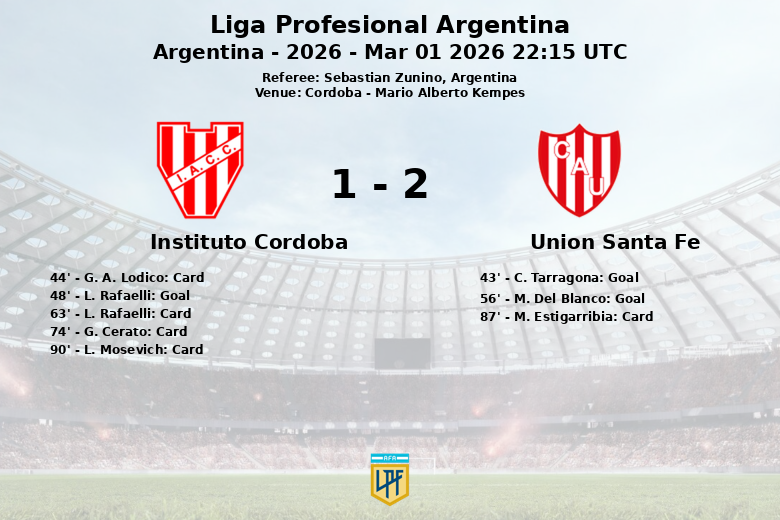 Remplacements dans l’quipe de instituto cordoba: À la 28e minute, J. E. Cordoba Mosquera est entré et L. Rafaelli est sorti., À la 46e minute, A. Bravo est entré et F. Jara est sorti., À la 66e minute, M. Fonseca est entré et N. Guerra est sorti., À la 66e minute, J. Mendez est entré et G. Abregu est sorti., À la 80e minute, A. Luna est entré et J. Lazaro est sorti.