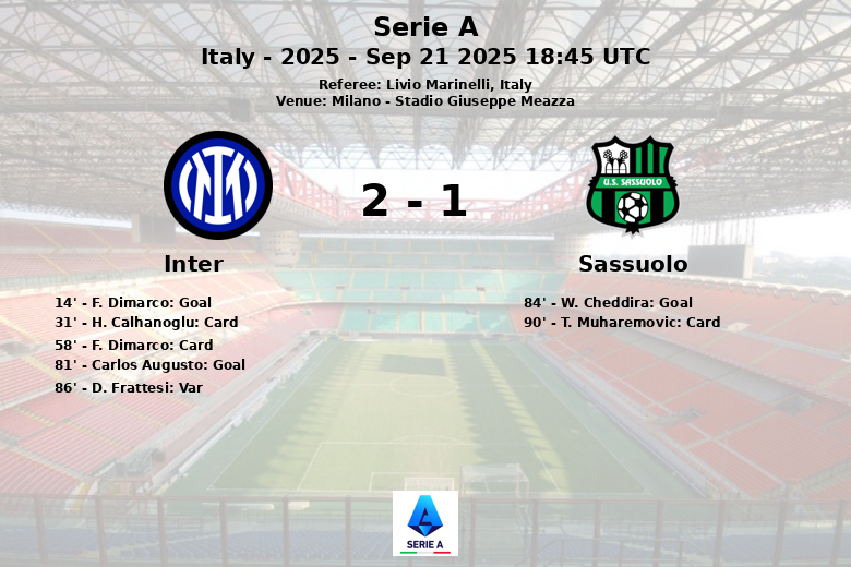 Le match s’est terminé par une victoire de l’Inter, qui a dominé la possession et les tirs, mais a souffert face à un Sassuolo combatif qui n’a jamais abandonné. L’arbitre Livio Marinelli a montré deux cartons jaunes à l’Inter et un à Sassuolo.