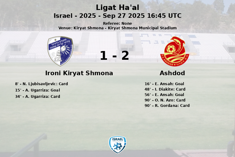Remplacements dans l’quipe de ironi kiryat shmona: À la 46e minute, H. Goldenberg est entré et I. Vaier est sorti., À la 70e minute, C. Martinez est entré et O. Benbenishti est sorti., À la 70e minute, Y. Mordechai est entré et A. Sheretsky est sorti., À la 78e minute, A. Ugarriza est entré et J. Al Halabi est sorti., À la 89e minute, S. David est entré et L. Deri est sorti.