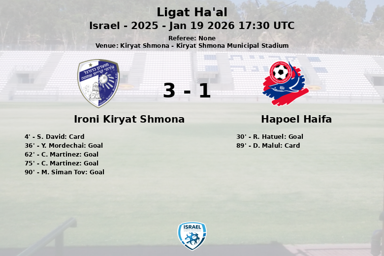 Remplacements dans l’quipe de ironi kiryat shmona: À la 63e minute, A. Sharetzky est entré et Y. Ackah est sorti., À la 63e minute, W. M. Alli est entré et A. Ugarriza est sorti., À la 79e minute, Y. Mordechai est entré et M. Siman Tov est sorti., À la 87e minute, C. Martinez est entré et A. Avraham est sorti.