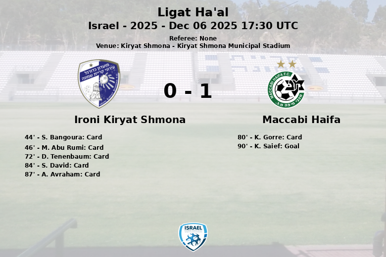 L’arbitre a passé un après-midi chargé, distribuant un total de six cartons jaunes, cinq pour Ironi Kiryat Shmona et un pour le Maccabi Haifa. Le match a été intense et très tactique, comme en témoignent les 14 fautes commises par l’équipe locale et les 13 par l’équipe visiteuse. Malgré les efforts d’Ironi Kiryat Shmona, le but tardif de Saief a donné la victoire au Maccabi Haifa dans un match serré. Les 10 corners du Maccabi Haifa contre les 3 de l’Ironi Kiryat Shmona reflètent la domination territoriale du vainqueur.