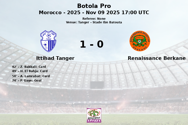 Tanger, Maroc – Dans un match disputé au Stade Ibn Batouta de Tanger, Ittihad Tanger a remporté une précieuse victoire contre Renaissance Berkane lors de la 8ème journée de la Botola Pro. Le match, qui s’inscrit dans le cadre de la saison 2025, a été marqué par la tension et les cartons.