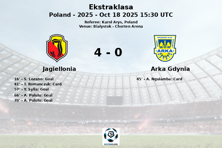 En seconde période, Jagiellonia a maintenu sa domination et a accru son avance avec un but de Y. Sylla à la 57e minute, assisté par J. Imaz. À partir de là, l’équipe locale n’a pas ralenti, et A. Pululu a scellé la victoire avec deux autres buts, aux 66e et 70e minutes, respectivement.