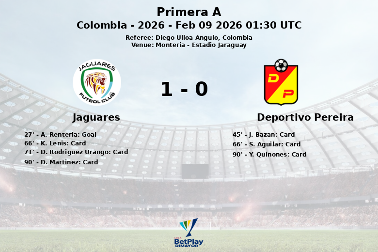 Montería a été le théâtre d’un match disputé pour la cinquième journée de Primera A, où Jaguares s’est imposé face à Deportivo Pereira. Un but d’A. Rentería à la 27e minute, servi par J. A. Altamiranda Arrieta, a fait la différence au tableau d’affichage.