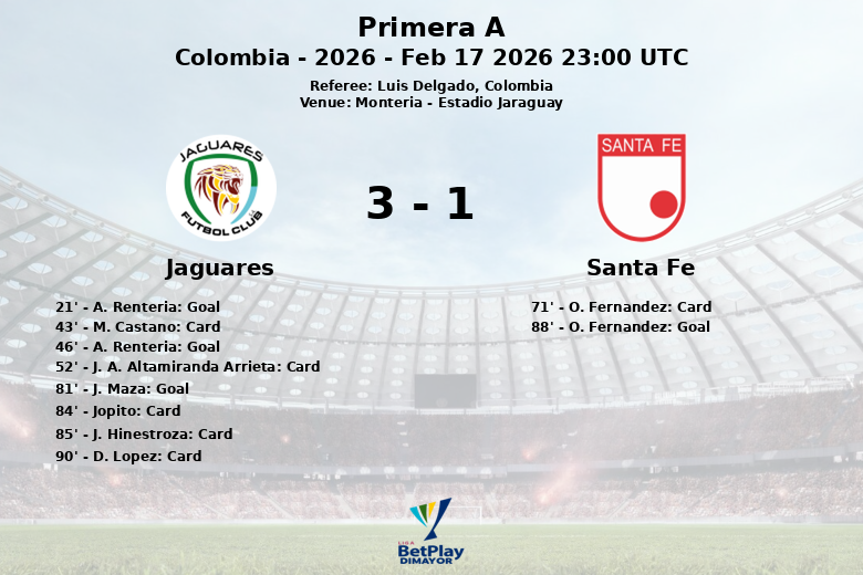 Jaguares a pris l’avantage grâce à une performance remarquable de A. Rentería, qui a marqué deux buts, l’un à la 21e minute et l’autre au début de la deuxième mi-temps, à la 46e minute, ce dernier avec une passe décisive de D. Rodriguez Urango. Malgré une possession de balle inférieure (41 % contre 59 % pour Santa Fe), Jaguares a su saisir ses opportunités. L’équipe locale a également fait preuve de solidité défensive, bien que M. Castaño, J. A. Altamiranda Arrieta, Jopito, J. Hinestroza et D. Lopez aient été avertis d’un carton jaune.