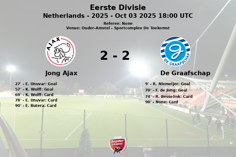 En deuxième mi-temps, Jong Ajax a pris l’avantage à la 57e minute avec un but de K. Wolff. Mais De Graafschap n’a pas abandonné et a trouvé l’égalisation définitive à la 70e minute avec un but de F. de Jong.