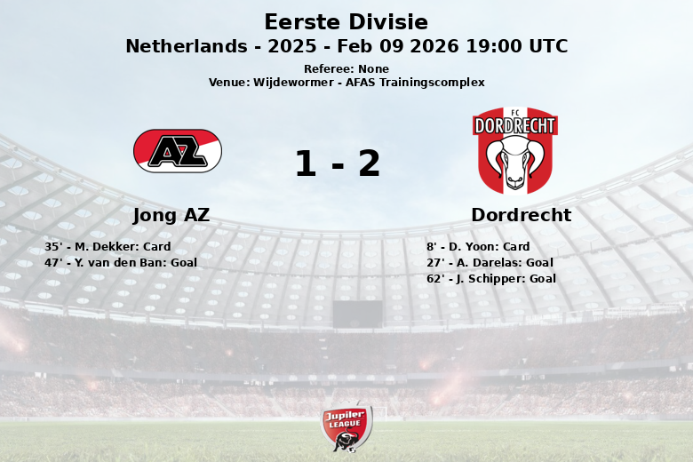 En deuxième mi-temps, Jong AZ a rapidement égalisé à la 47e minute grâce à un but de Y. van den Ban, sur une passe de W. Bouziane. Un malheureux but contre son camp de J. Schipper à la 62e minute a redonné l’avantage à Dordrecht. Le score est resté inchangé, scellant le match nul final.