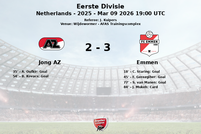 Emmen a ouvert le score à la 18e minute avec un but de C. Staring, assisté par R. Postema. Cependant, Jong AZ a répondu à la 35e minute avec un but de A. Oufkir, égalisant ainsi le score. Juste avant la mi-temps, F. Gerezgiher a redonné l’avantage à Emmen, assisté par L. Larsen, clôturant la première mi-temps avec un score favorable à l’équipe visiteuse.