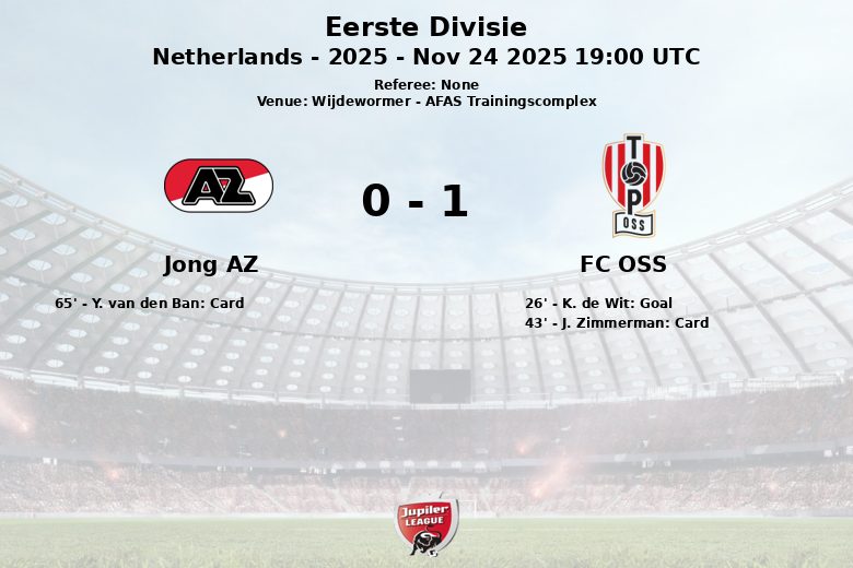 Dans un match correspondant à la 17e journée de l’Eerste Divisie qui s’est déroulé à l’AFAS Trainingscomplex de Wijdewormer, le FC Oss a battu Jong AZ lors d’une rencontre marquée par l’intensité et les batailles au milieu de terrain. Le seul but de K. de Wit à la 26e minute, sans passe décisive, a suffi à faire pencher la balance en faveur de l’équipe visiteuse.