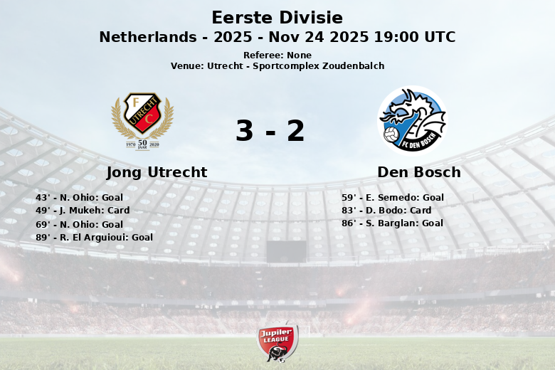 Remplacements dans l’quipe de jong utrecht: À la 60e minute, E. Demircan est entré et V. Plantinga est sorti., À la 60e minute, N. Dundas est entré et R. El Arguioui est sorti., À la 76e minute, M. Jensen est entré et S. van der Wegen est sorti., À la 84e minute, N. Ohio est entré et S. Ebite est sorti., À la 84e minute, M. Ghaddari est entré et W. Kooy est sorti.