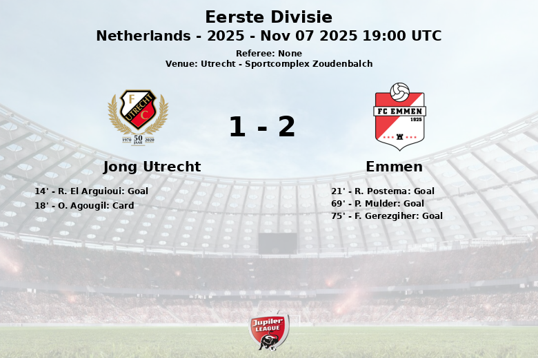 Utrecht, Pays-Bas – Lors d’un match disputé au Sportcomplex Zoudenbalch, Jong Utrecht et Emmen ont offert une rencontre pleine de rebondissements et d’émotions en Eerste Divisie. Malgré une possession de balle de seulement 41%, Jong Utrecht a pris l’avantage dès la 14e minute grâce à un but de R. El Arguioui, sur une passe décisive de E. Demircan.