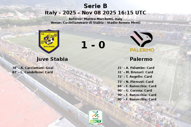 Remplacements dans l’quipe de juve stabia: À la 71e minute, A. Gabrielloni est entré et R. Burnete est sorti., À la 79e minute, G. Leone est entré et C. Pierobon est sorti., À la 90e minute, A. Cacciamani est entré et M. Baldi est sorti.