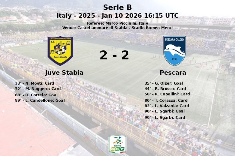 Pescara a pris l’avantage à la 35e minute grâce à un but de G. Olzer. La première mi-temps a été intense, avec des cartons jaunes pour N. Mosti pour Juve Stabia et R. Brosco pour Pescara.