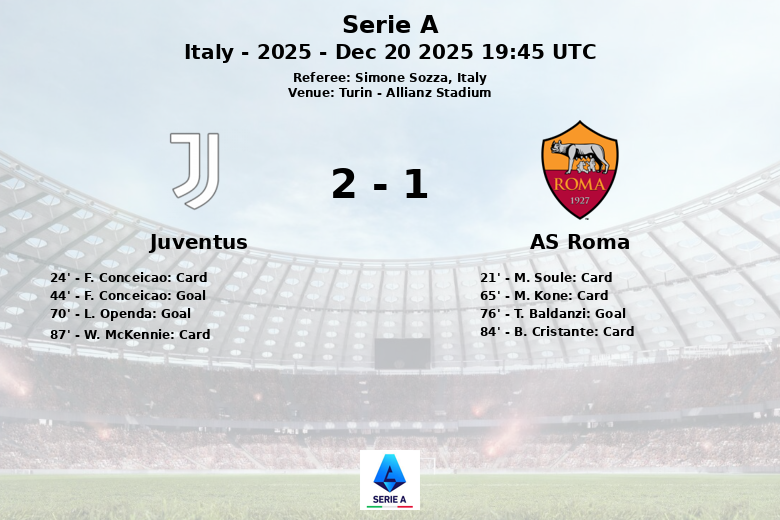 La première mi-temps a vu la Juventus prendre l’avantage grâce à un but de F. Conceicao à la 44e minute, sur une passe décisive d’A. Cambiaso. Auparavant, le match avait été ponctué de deux cartons jaunes, un pour M. Soule de la Roma à la 21e minute et un autre pour F. Conceicao de la Juventus à la 24e minute.