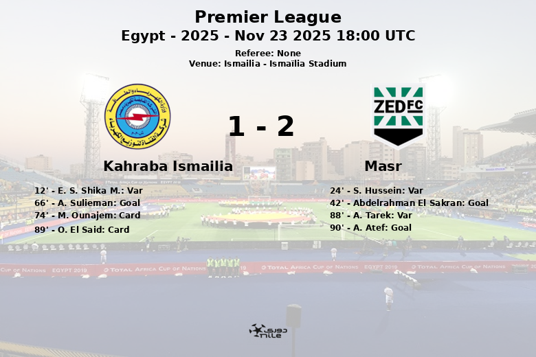 Dans le temps additionnel, Masr a réussi à égaliser avec un but de A. Atef à la 90e minute, assisté par M. Yasser, scellant un match nul 2-2 final. Le match a été marqué par plusieurs décisions de la VAR qui ont influencé le résultat et suscité des débats. Kahraba Ismailia a effectué 10 tirs (3 cadrés, 5 non cadrés) et obtenu 6 corners, tandis que Masr a effectué 13 tirs (5 cadrés, 4 non cadrés) et seulement 1 corner.