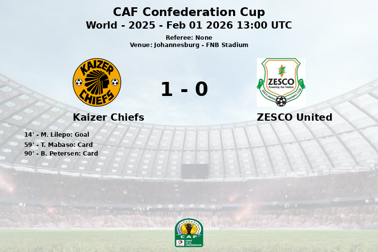 Johannesburg, South Africa – In a spirited match held at the FNB Stadium, Kaizer Chiefs emerged victorious against ZESCO United in the fourth round of the CAF Confederation Cup. Kaizer Chiefs dominated possession with 53% compared to ZESCO United’s 47%, with the home team securing the win thanks to a goal by M. Lilepo in the 14th minute, assisted by M. Vilakazi.