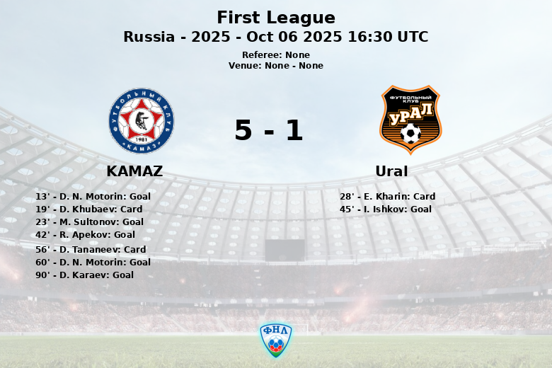 NABEREZHNYE CHELNY, Russie – Lors d’un match de la Première Ligue russe disputé le 6 octobre 2025, KAMAZ a démontré sa supériorité sur l’Oural avec une victoire éclatante. Le match, correspondant à la 13e journée de la saison régulière, a été marqué par un nombre élevé de buts et quelques cartons.