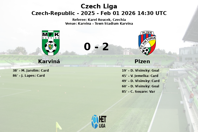 Le premier but de Plzen est arrivé à la 19e minute, grâce à D. Visinsky, sur une passe de L. Cerv. Karvina a essayé de réagir, mais s’est heurté à une défense bien organisée et à une possession stérile. La première mi-temps s’est terminée avec un carton jaune pour V. Jemelka de Plzen et un autre pour M. Jarolim de Karvina.