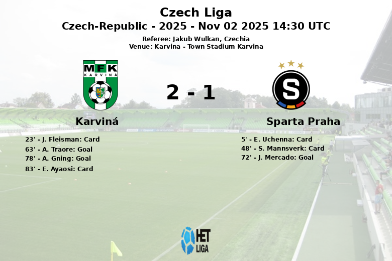 Le match s’est animé en seconde période. À la 63e minute, A. Traore de Karviná, assisté par D. Krcik, a ouvert le score. Cependant, la joie des locaux a été de courte durée, puisque J. Mercado du Sparta Prague, assisté par V. Birmancevic, a égalisé à la 72e minute. L’égalité a été de nouveau rompue lorsque A. Gning, assisté par A. Labik, a marqué pour Karviná à la 78e minute.