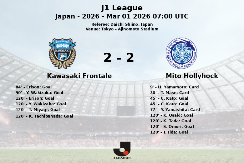 Tokyo, Japon – Lors d’une rencontre électrisante qui s’est déroulée au stade Ajinomoto, le Mito Hollyhock et le Kawasaki Frontale ont fait match nul dans un match riche en émotions et en buts. Le match, correspondant à la quatrième journée de la saison régulière de la J1 League, était arbitré par Daichi Shiino.