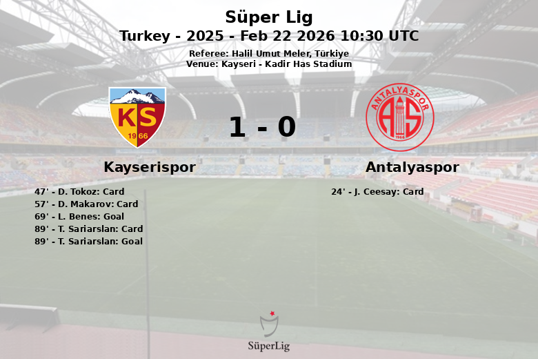 Le match est devenu tendu avec plusieurs avertissements, Antalyaspor recevant un carton jaune et Kayserispor trois. Alors qu’il semblait que le match se terminerait par un match nul, T. Sariarslan, à la 89e minute, a déclenché l’euphorie dans le stade avec un but qui a assuré la victoire à Kayserispor, grâce à une passe décisive de L. Benes, se rachetant ainsi de son penalty manqué. Le score final était de 1-0 en faveur de Kayserispor.