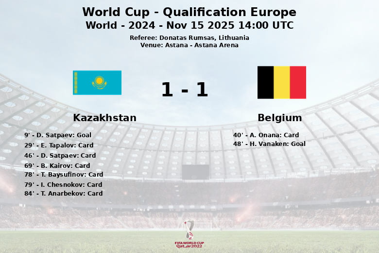 Le match a été ponctué par un nombre élevé de cartons, reflétant l’intensité du jeu. Le Kazakhstan a accumulé cinq cartons jaunes (E. Tapalov, D. Satpaev, B. Kairov, T. Baysufinov, T. Anarbekov) et un carton rouge (I. Chesnokov). La Belgique, quant à elle, a reçu un carton jaune pour A. Onana. L’expulsion de Chesnokov à la 79e minute a encore compliqué les aspirations du Kazakhstan. Le match, correspondant à la phase de groupes des qualifications européennes pour la Coupe du Monde, a clairement mis en évidence la domination belge, malgré le vaillant effort initial du Kazakhstan.