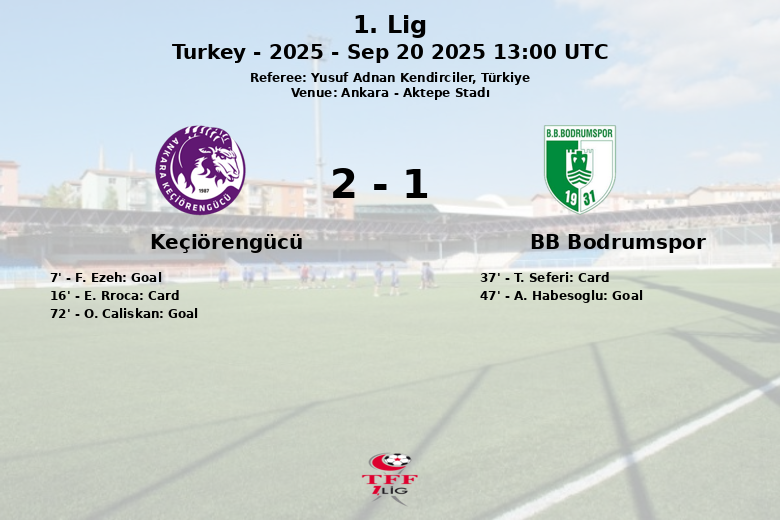 Remplacements dans l’quipe de keçiörengücü: À la 62e minute, E. Rroca est entré et H. Ayan est sorti., À la 71e minute, O. Roshi est entré et J. Fernandes est sorti., À la 87e minute, M. Diouf est entré et H. Osman est sorti., À la 87e minute, A. Dere est entré et B. Keskin est sorti.