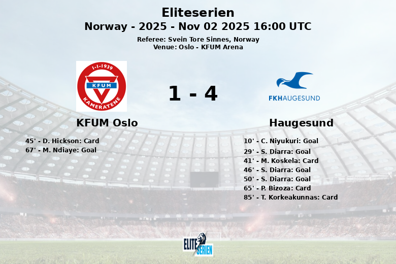 Haugesund a ouvert le score tôt, à la 10e minute, avec un but de C. Niyukuri assisté par N. Hamalainen. Ils ont augmenté leur avance à la 29e minute avec un but de S. Diarra, grâce à une passe décisive de Niyukuri, qui a réalisé une performance exceptionnelle. Diarra a marqué à nouveau au début de la seconde mi-temps, à la 46e minute, assisté par B. Leite, puis à nouveau à la 50e minute sans assistance. KFUM Oslo a réduit l’écart à la 67e minute avec un but de M. Ndiaye, mais cela n’a pas suffi à contrer l’efficacité de l’attaque adverse.