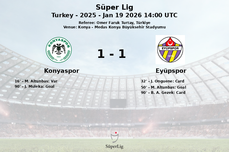Dans les dernières minutes, Konyaspor a réussi à égaliser à la 90e minute grâce à un but de J. Muleka, sauvant ainsi un point précieux devant ses supporters. Le match, arbitré par Omer Faruk Turtay, a été caractérisé par un nombre élevé de fautes (14 pour Eyüpspor et 7 pour Konyaspor) et deux cartons jaunes pour Eyüpspor.