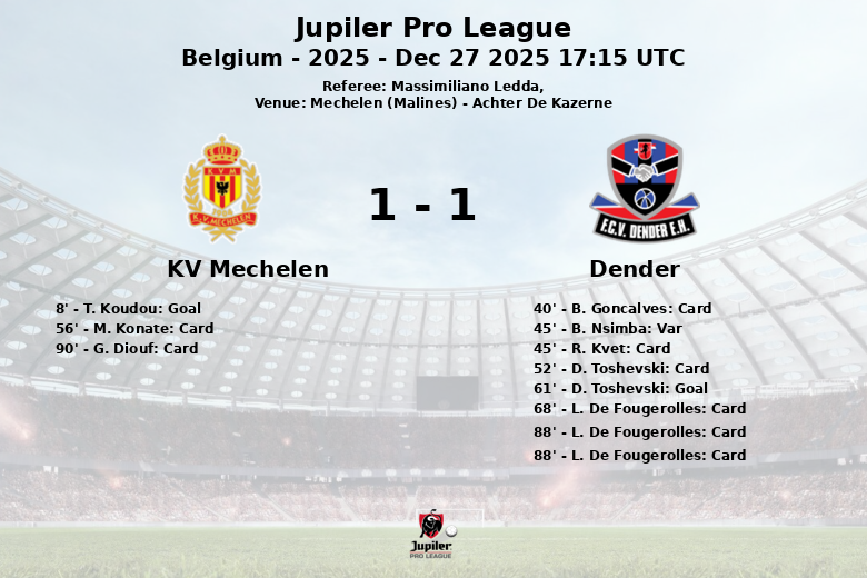 Mechelen (Malines), Belgique – Le KV Mechelen et Dender se sont affrontés dans un match vibrant à l’Achter De Kazerne, comptant pour la 20e journée de la Jupiler Pro League. Le match, disputé sous l’œil attentif de l’arbitre Massimiliano Ledda, s’est terminé par un match nul qui reflète l’intensité et la combativité des deux équipes.