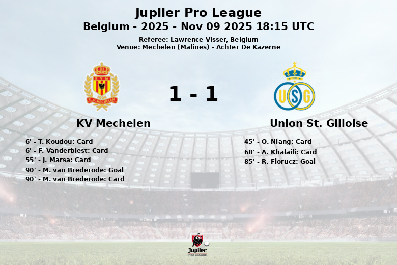 Alors qu’il semblait que l’Union St. Gilloise allait remporter la victoire grâce au but de R. Florucz à la 85e minute, sur une passe décisive de R. Schoofs, le KV Malines a trouvé l’égalisation dans le temps additionnel. M. van Brederode a transformé un penalty à la 90e minute, déclenchant l’euphorie chez les supporters locaux. Van Brederode a également reçu un carton jaune juste après avoir marqué.