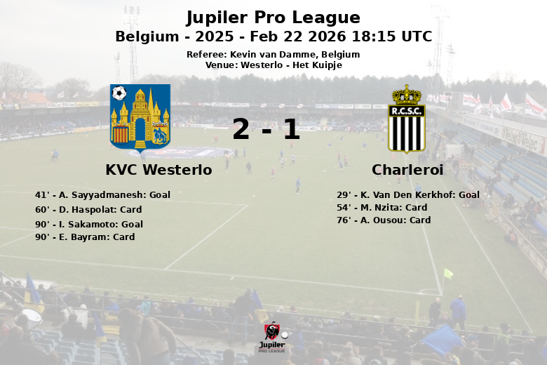 La deuxième mi-temps a vu une augmentation de la tension, reflétée par les cartons jaunes montrés à M. Nzita et A. Ousou pour Charleroi, et à D. Haspolat et E. Bayram pour le KVC Westerlo. Alors que le match semblait se diriger vers un match nul, I. Sakamoto a marqué à la 90e minute, assurant la victoire du KVC Westerlo grâce à une passe décisive de A. Sayyadmanesh.