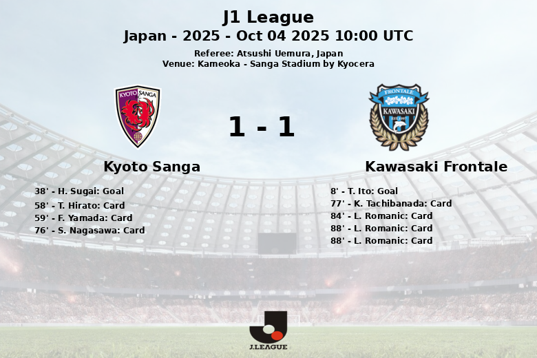 Kameoka, Japon – Dans un match disputé au Sanga Stadium by Kyocera, Kawasaki Frontale et Kyoto Sanga ont fait match nul lors d’une rencontre riche en émotions et en cartons. Le match, comptant pour la 33e journée de la J1 League, saison 2025, a vu Kawasaki Frontale prendre l’avantage dès la 8e minute avec un but de T. Ito, sur une passe décisive d’Erison. Cependant, Kyoto Sanga a répondu avec force, H. Sugai égalisant à la 38e minute, grâce à une passe de T. Matsuda.