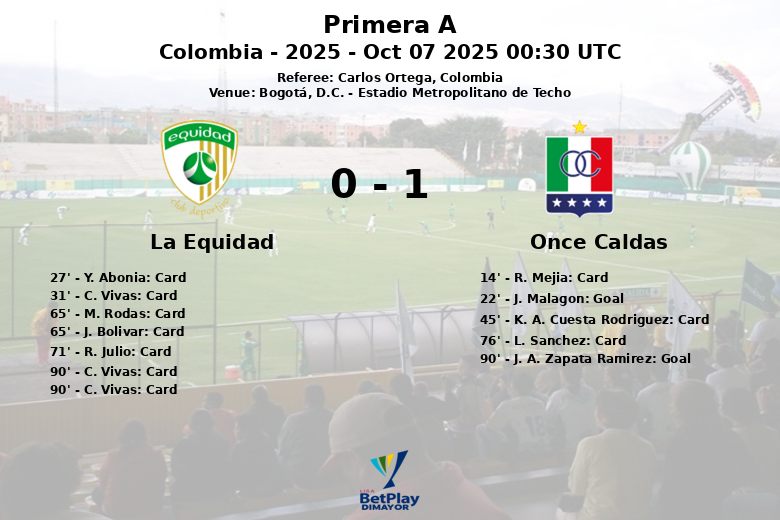 Bogotá, D.C. – Dans un match disputé à l’Estadio Metropolitano de Techo, Once Caldas a remporté la victoire contre La Equidad dans une rencontre qui a tout eu : des buts, des expulsions et des cartons jaunes.