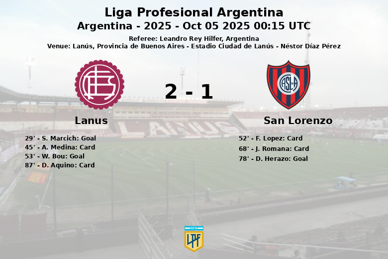 Le premier but du match est intervenu à la 29e minute lorsque S. Marcich, sur une passe de W. Bou, a ouvert le score pour Lanús. La première mi-temps a également été marquée par un carton jaune pour A. Medina de Lanús à la 45e minute. En deuxième mi-temps, W. Bou a creusé l’écart pour Lanús à la 53e minute. San Lorenzo a réagi plus tard, à la 78e minute, avec un but de D. Herazo, mais cela n’a pas suffi pour égaliser. Le match a été supervisé par l’arbitre Leandro Rey Hilfer.