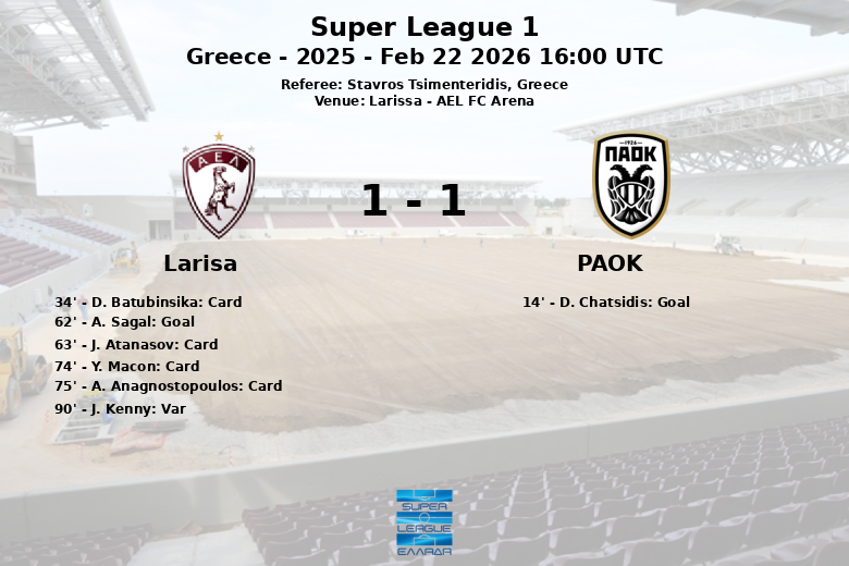 Larissa, Grèce – Dans un match disputé à l’AEL FC Arena, Larisa et le PAOK ont fait match nul dans un match qui a tenu les supporters en haleine jusqu’à la dernière minute. Le match, comptant pour la 22e journée de la Super League 1, a été marqué par l’intensité et les décisions controversées.
