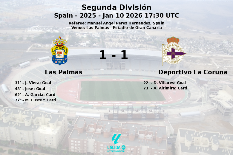En seconde période, Las Palmas a contrôlé le jeu, conservant 62 % de la possession de balle et se créant davantage d’occasions de but. Le Deportivo, avec 38 % de possession, a tenté de réagir mais n’a pas réussi à percer la défense locale. Le match a été marqué par une grande intensité, reflétée par les cartons jaunes attribués à A. Garcia et M. Fuster pour Las Palmas, et à A. Altimira pour le Deportivo. Las Palmas a dominé les tirs, avec 14 contre 7 pour le Deportivo, ainsi que les corners, avec 7 contre 3.