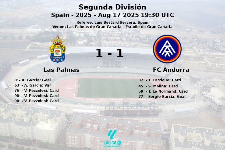 Las Palmas de Gran Canaria, 17 août 2025 – Dans un match disputé à l’Estadio de Gran Canaria, Las Palmas et le FC Andorra ont fait match nul, laissant un goût doux-amer aux deux équipes. Le match, correspondant à la première journée de la Segunda División, a été marqué par l’intensité et plusieurs décisions arbitrales controversées.
