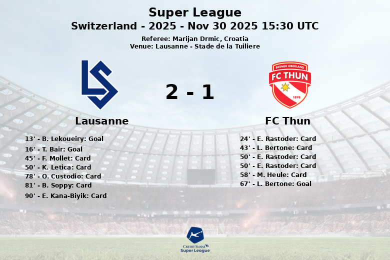Lausanne, Suisse – Dans un match disputé au Stade de la Tuiliere, Lausanne et FC Thun ont fait match nul, dans une rencontre remplie d’émotions et de cartons. Lausanne a pris l’avantage dès le début avec un but de B. Lekoueiry à la 13e minute, grâce à une passe décisive de G. Diakite. Peu de temps après, T. Bair a creusé l’écart sur penalty à la 16e minute. Le match est devenu sensiblement tendu, comme en témoigne une série de cartons jaunes distribués aux joueurs des deux équipes tout au long de la première mi-temps.